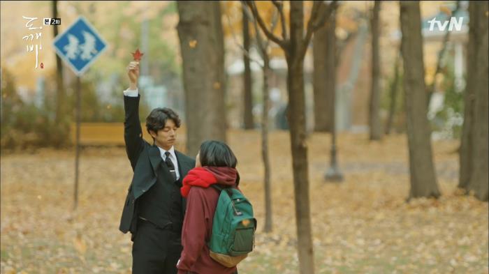 鬼怪大叔仗着自己的身高优势,抓住了一片落下来的枫叶,就是不给池恩倬,两人为了抢这片枫叶,嬉笑打闹。