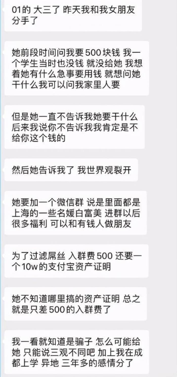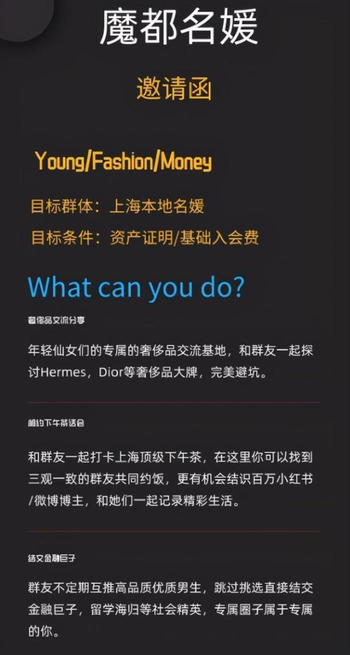 每一个人交500元,同时晒出支付宝10万元资产的截图,就可以加入这个群。那么这些女人为何要加入这些群,除了希望享受各种福利之外,最大的目标就是希望跟有钱人交朋友,然后有一天也可以嫁入豪门。更加让人意外的就是,这样的名媛团,如果同时5个人加入,还可以打折,一个人250元就可以了。