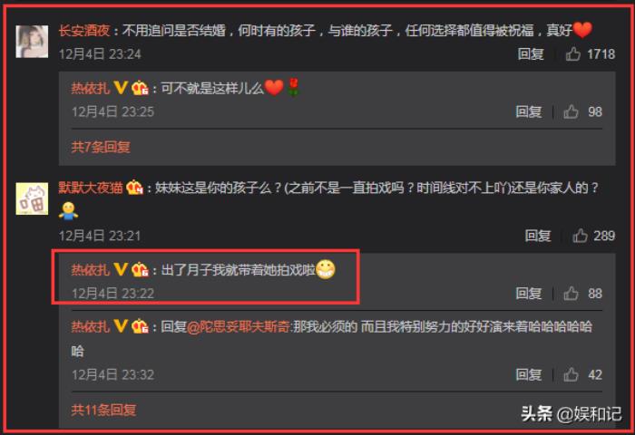 有粉丝在评论区质疑热依扎孩子是不是她的,热依扎则回复:出了月子就带娃拍戏了!