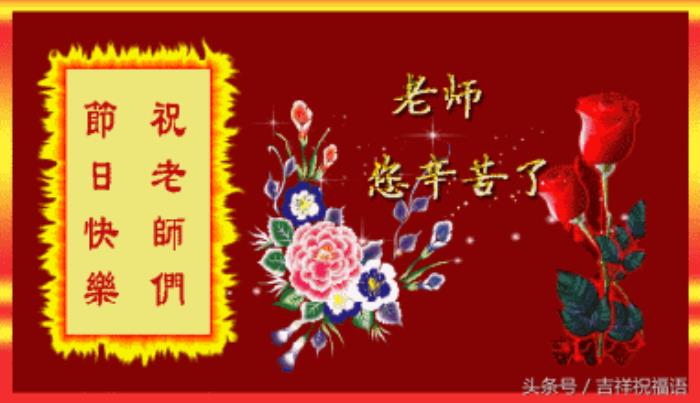 爱国教育,至诚谆谆;尊师重道,你的嘱愿;孝敬美德,苦口婆心;一生授教,无悔无怨;你的形象,高大灿烂;教师节到,学生祝愿;愿你健康,一生平安!