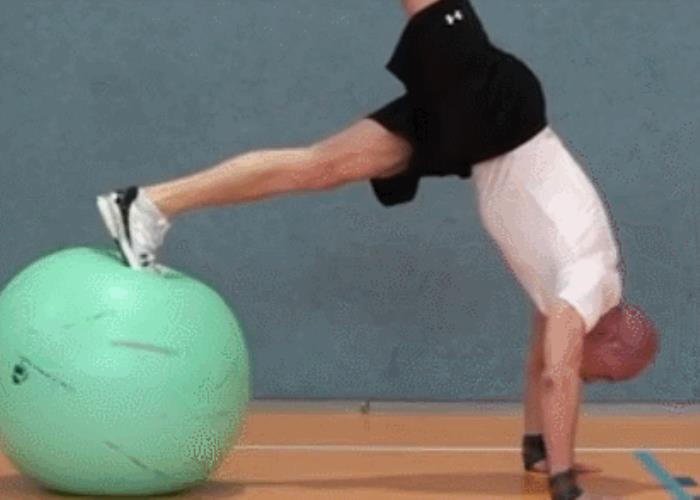 这也是健身球训练最难的动作之一,这样的训练要求你要有强力的肩部和背部肌肉。训练时,单脚垫起健身球,呈倒立状态,再缓慢放下另一条腿,再收缩抬高另一条腿。此动作较难,要有良好的身体协调性和伸展性,可以训练到肩部和背部肌肉,因此是不失为健身球健身的更高水平。