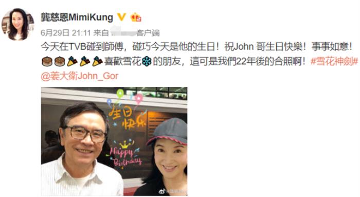 6月29是香港邵氏影星姜大卫生日,龚慈恩发文为他庆生:今天在TVB碰到师傅,碰巧今天是他的生日,祝John哥生日快乐!事事如意!最后还特别提到喜欢《雪花神剑》的朋友,这是她和姜大卫22年后的合照。