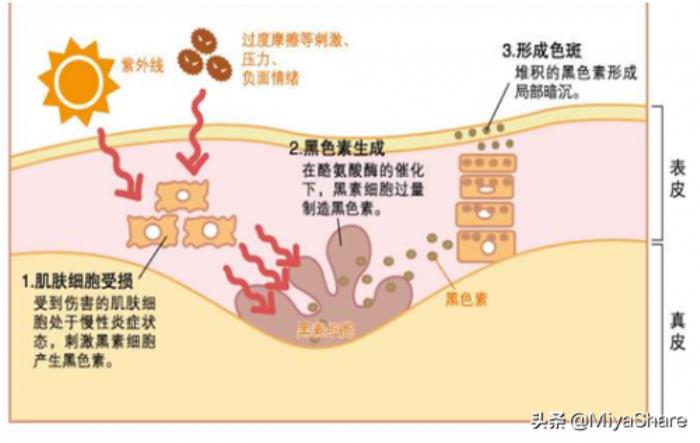 在皮肤结构中,决定肤色深浅的关键性因素是黑色素。当皮肤受到紫外线、情绪压力等刺激时会导致皮肤肌细胞处于炎症状态。而炎症会刺激黑色素细胞控制中心生产黑色素。黑色素产生后会随着细胞代谢被运输到皮肤角质层表面,变成肉眼可见的斑点。
