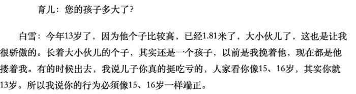 相比起有声有色的事业,白雪的家庭生活就没有太多曝光了。对待自己的私生活,白雪一直是比较低调的态度,只在很久之前采访中透露过儿子13岁就已经1米8,表示自己会对儿子要求比较严格,可见白雪的家庭生活还是比较美满的。