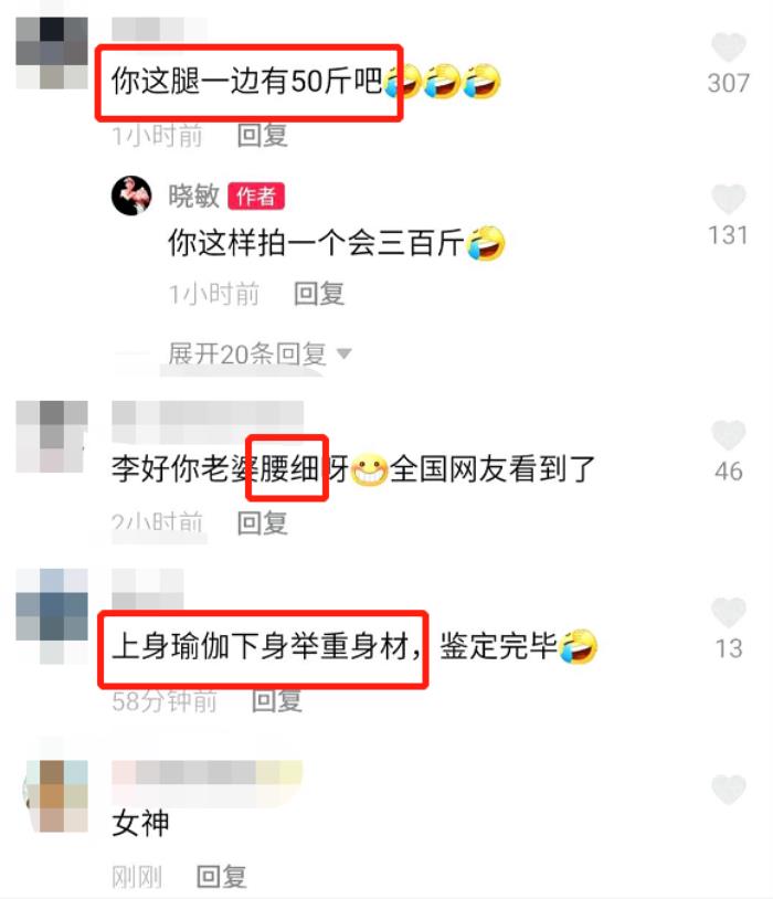 看到郭晓敏的视频,许多网友夸赞郭晓敏的腰很细,有网友调侃称郭晓敏的腰虽然细,但是跪坐在地上的腿看起来却很粗,一条腿就像有50斤的样子。对此,郭晓敏回复称如果该网友这样拍的话会有300斤,此外,还有网友称郭晓敏的上身是瑜伽身材,下身则是举重身材。