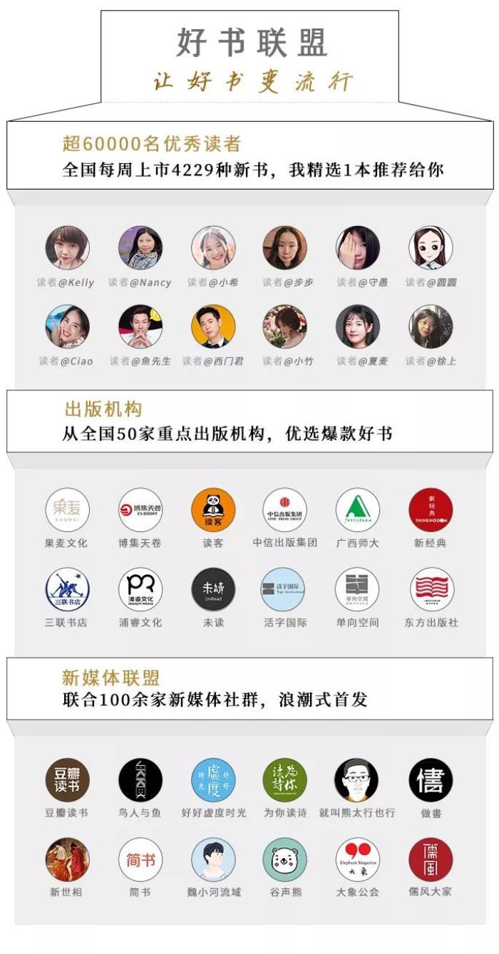 “好书联盟”由「好好虚度时光」联合100家新媒体社群共同发起,从全国重点出版机构甄选年度优选好书,每本必是精品。每周1本,推荐给千万读者。我们是出版者、共读者与推荐者。希望每本值得珍藏品读的好书,都能流行。
