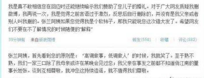 “看来儿子的装×是遗传母亲的狂想症,张兰阿姨你好歹也算个知名企业家怎能随意造谣呢?你花多少钱办个婚礼不关我事,但是你从未和我父亲见过面你怎能胡说(他)和你关系好,甚至赞助你儿子的婚礼呢?高调就高调呗,本身也不是错,但你装啥啊?不还说礼金全捐吗,你给我个发票看看呗?”