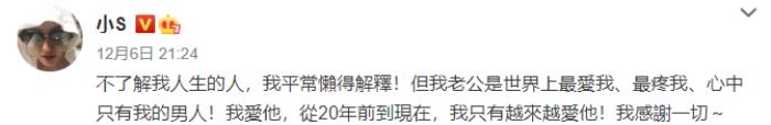 小S作为公众人物,家庭生活一直是大家关注的焦点,面对大家的猜疑,小S也是强势表白老公:"我老公是世界上最爱我、最疼我、心中只有我的男人!我爱他,从20年前到現在,我只有越來越愛他!"