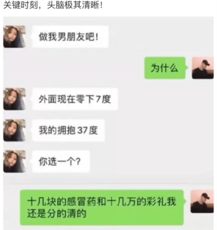 不得不说,男生在某些时刻,脑子简直比女生算折扣的速度还要快。外边的天气再冷,也只是吃感冒药而已。但有女朋友不一样,结婚的话,没有个十几万彩礼是解决不了的。