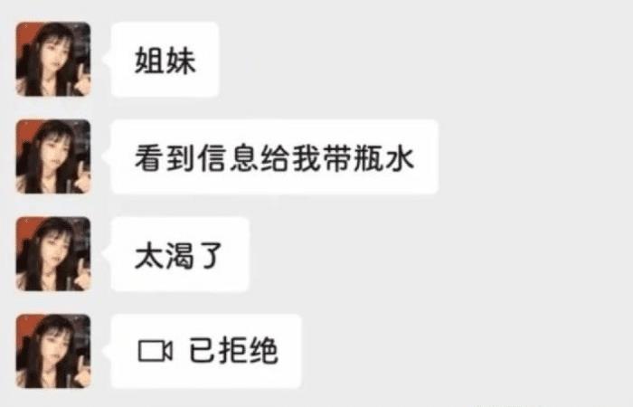 小姐姐太渴了,给自己的闺蜜发消息,来的时候给自己带一瓶水,实在是太渴了。上课的时候一直都等着,结果等到自己的闺蜜到了,看到饮料的那一刻懵了。