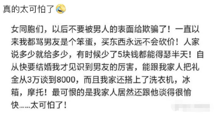 我的天,这样的男人也太恐怖了吧,这种男人的心机也太厉害了。一开始在老丈人家表现出非常好的模样,这样结婚的时候就能少花多少,就花多少,搞得跟我嫁不出去一样~
