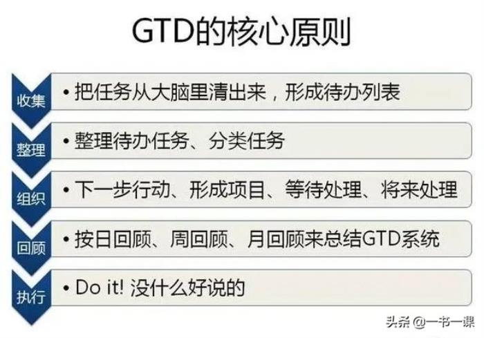 GTD五大步骤:收集、整理、组织、回顾与行动。