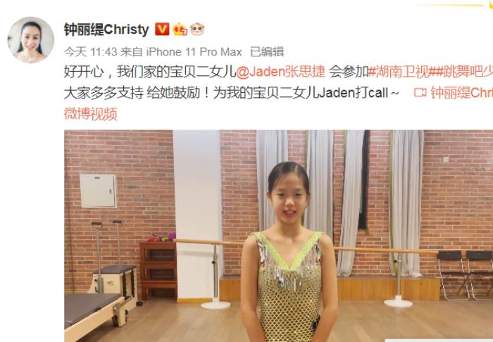 1月14日,钟丽缇在自己的社交平台中为自己的二女儿加油打call,并晒出了一段张思捷的舞蹈视频!原来是钟丽缇帮女儿报名参加了芒果选秀节目《跳舞吧少年》虽然说这个选秀节目在网络上并不太火,但是对于孩子来说却是一种锻炼!