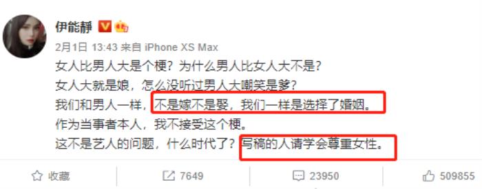 昨天,伊能静在微博发文写道︰“女人比男人大是个梗?为什么男人比女人大不是?女人大就是娘,怎么没听过男人大嘲笑是爹?我们和男人一样,不是嫁不是娶,我们一样是选择了婚姻。作为当事者本人,我不接受这个梗。这不是艺人的问题,什么时代了?写稿的人请学会尊重女性。”