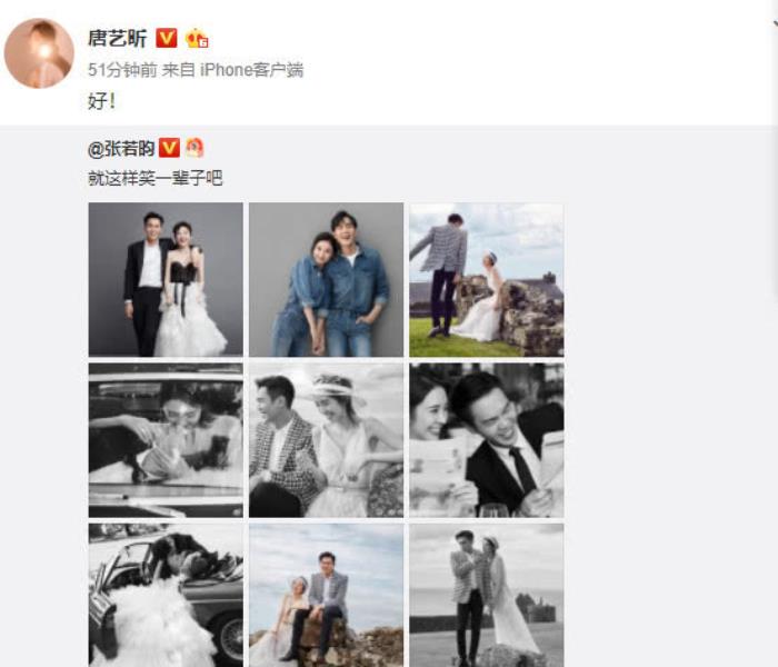 在婚礼的前几个小时,一直没有动静的张若昀在自己的微博晒出了两人甜蜜九宫格结婚合照,并且配文称“就这样笑一辈子吧”,唐艺昕也第一时间回复到“好”,简短的话语充满了彼此满屏的爱意和掩盖不住的幸福