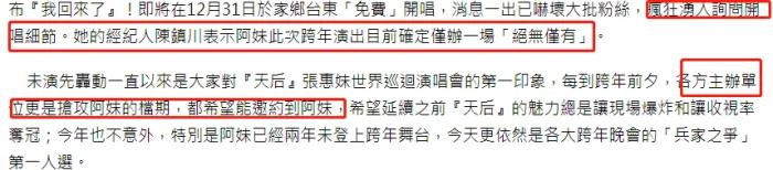 24日张惠妹官方平台高调宣告天后回归歌坛的消息,一时炸起不少粉丝,大家纷纷留言询问演唱会信息。其经纪人更是表示该演唱会定在跨年,并且是绝无仅有的规模。消息发出后,各大平台也争抢预定张惠妹的档期,期望对方可以加盟跨年演出。