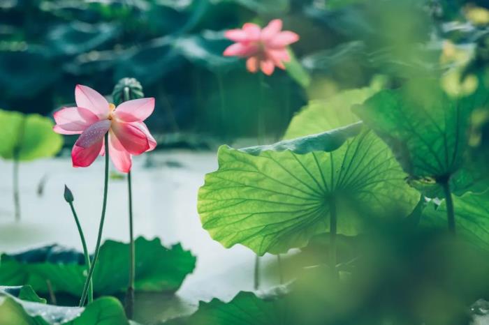 菱叶萦波荷飐风,荷花深处小船通。