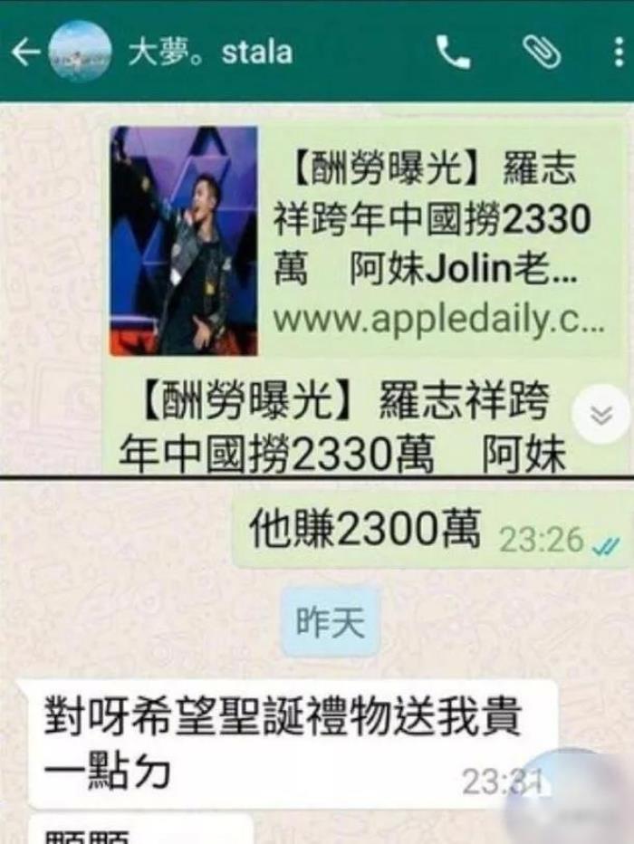 在她朋友转发了一条,罗志祥商演赚了2000万的新闻时候。于大梦回复:“对啊,希望他可以送我贵一点的圣诞礼物”。