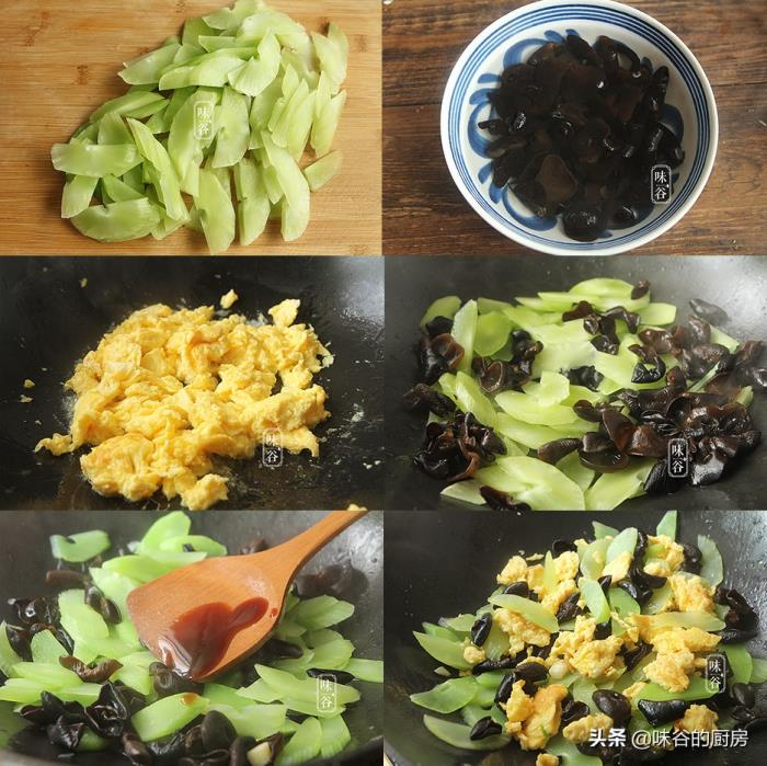【材料】:莴笋 1棵,干木耳 10克,鸡蛋 2个,蚝油 1汤匙、盐 1茶匙