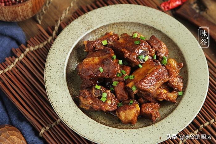最后大火收汁一下,出锅撒上葱花,美味的红烧排骨就做好啦。