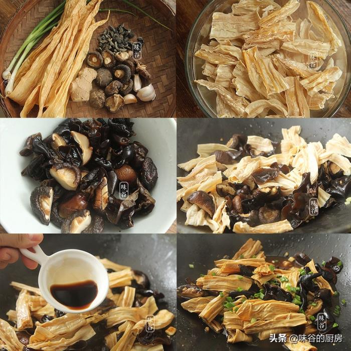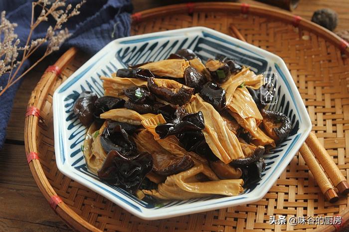 【材料】:腐竹 3根,干香菇 30克,干木耳 10克,姜蒜 适量,生抽 2汤匙,蚝油 1汤匙,香醋 1汤匙,盐 少许,