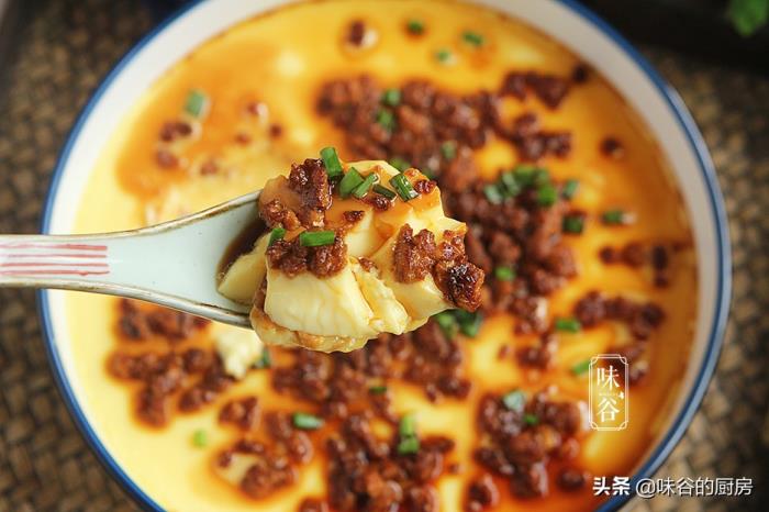 炒好的肉末和酱汁倒在蒸好的鸡蛋羹上即可。