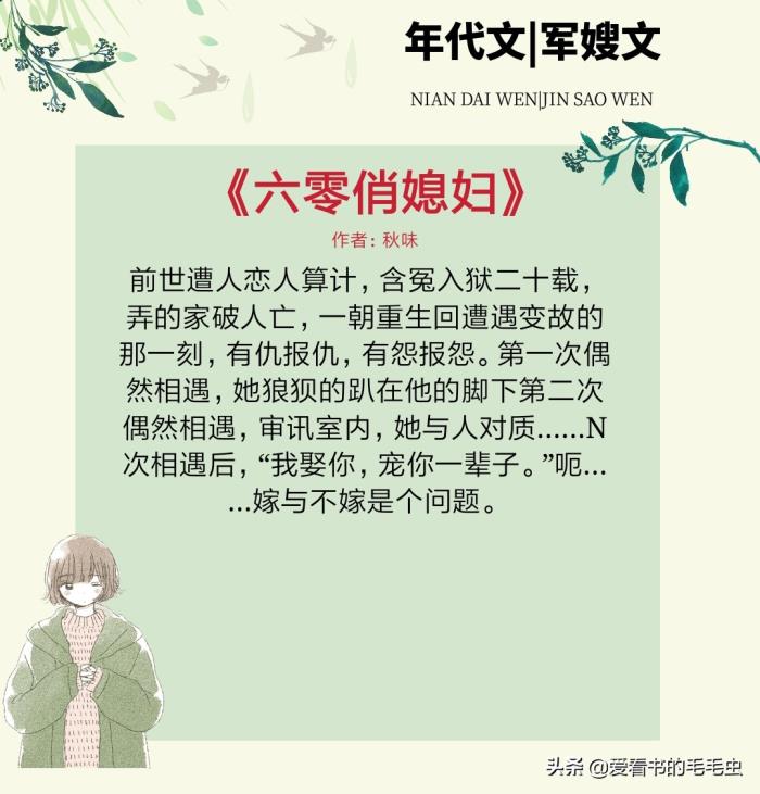小短评:重生军婚军宠。男女主家里都有军人!所以长大后的男女主也都成了军人。特种兵和军医!完美!还是青梅竹马!闷骚男主,聪明伶俐又上进的女主,般配!女主现代医生被疯狂家属杀死,还不是她病人,死的冤枉。魂穿六零年三岁女娃身上,军人家庭,两哥哥,一弟一妹,生活艰苦,比上不足比下有余。女主爸爸是部队领导,穿过来就是在部队生活,兄妹四个,一家人相处模式特别特别温馨!没有极品家人的,尤其明和大哥是很会做饭的暖男噢,很圈粉。很暖的文,强烈推荐!