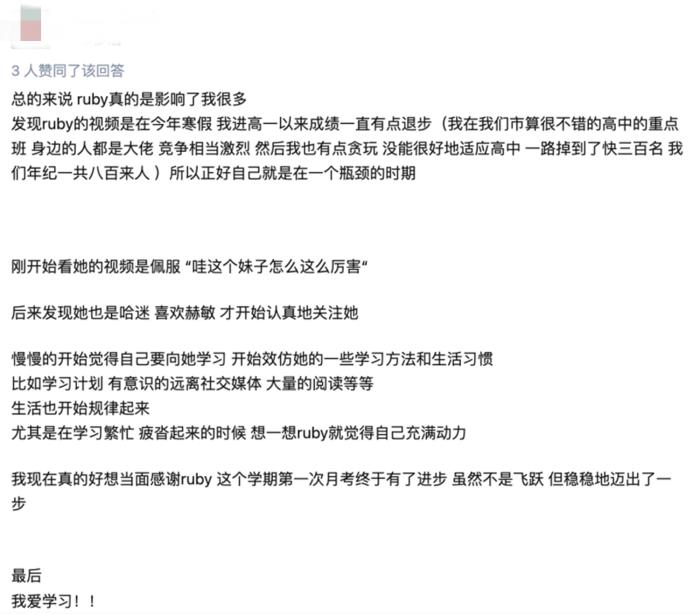 更有人因为跟随她的学习节奏,成绩大幅度提升,这是一种无声的互动。