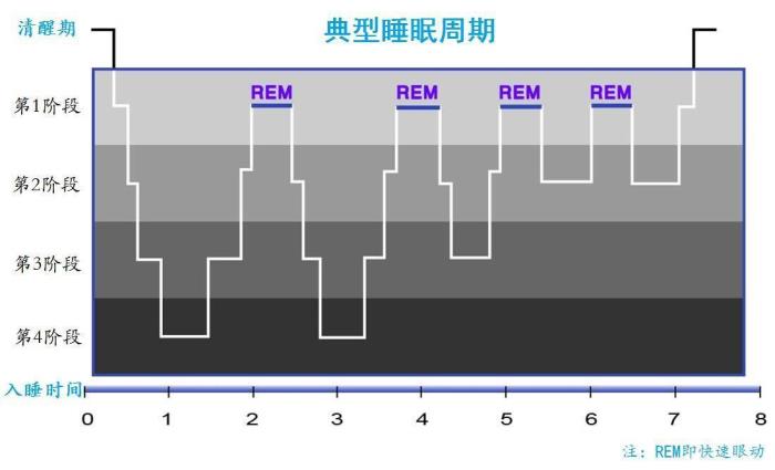 注意的是,咱们一般理解的睡眠是由浅到深,一觉睡到天亮,但实际上是人体在正相睡眠以及异相睡眠(REM睡眠)之间有规律的切换,一般情况下,从正相睡眠期到异相睡眠期(REM睡眠)是一个周期,一个周期大概是90分钟左右,一晚上会经历4-5个周期,因此我们会做好几个梦。