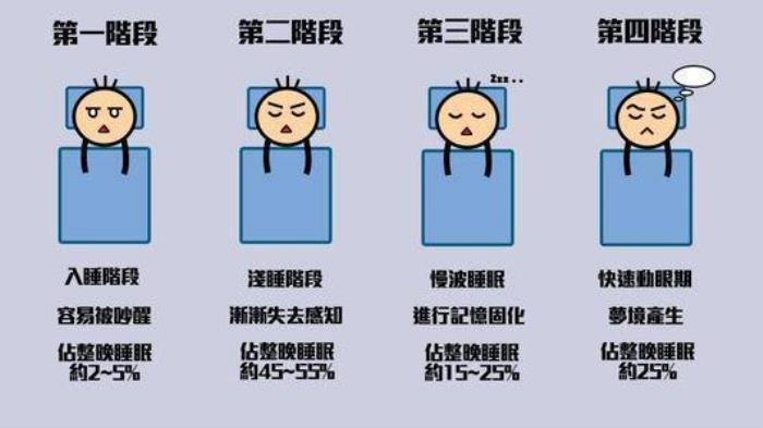 第二个阶段:浅睡眠第二个阶段开始正式进入睡眠,这个时候还称不上是深睡眠,只是眼睛活动停止,大脑思维变慢,甚至体温也会降低,但这时呼吸会很规律, 比起第一阶段,这个时候的睡眠比较不容易被吵醒。