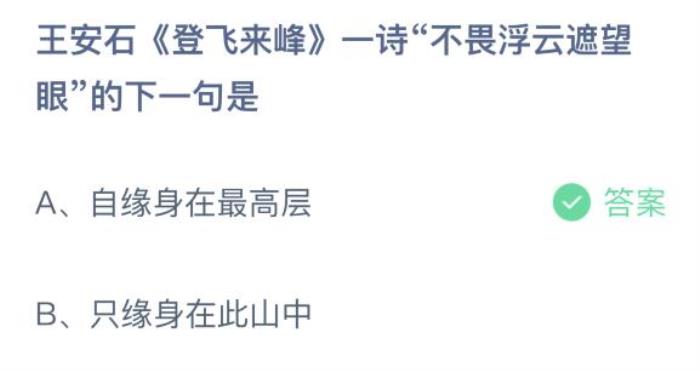 王安石登飞来峰一诗不畏浮云遮望眼的下一句是什么?这是蚂蚁庄园2月13号今日庄园小课堂的问题,很多用户还不知道答案,本文小编会为大家详细介绍2月13日今天蚂蚁庄园课堂小鸡饲料答案。