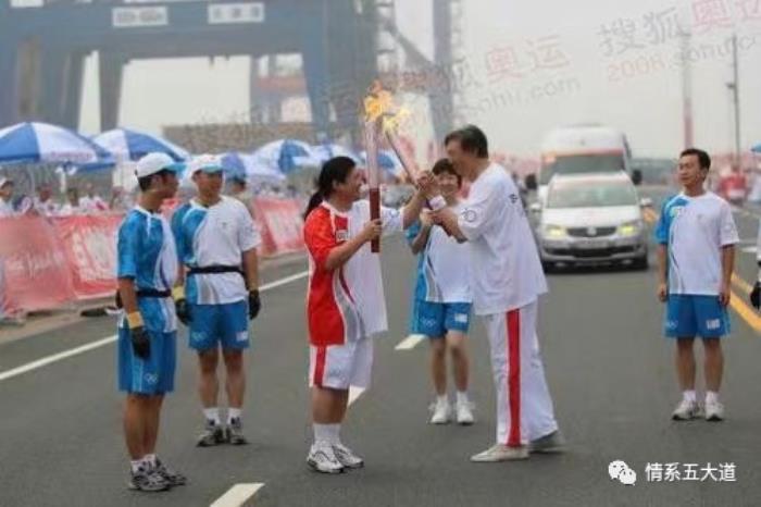 北京奥运会火炬天津站传递中,第5号火炬手刘欢与上一棒冯骥才交接。