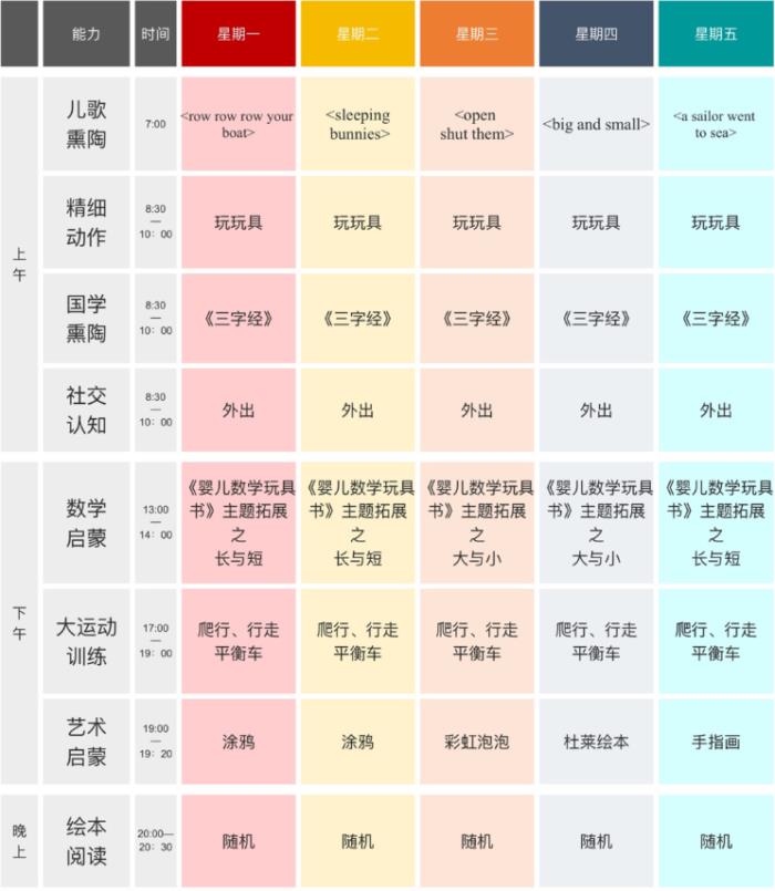 今天背着娃去商场里面转的时候遇到了一个神仙妈妈,简单的聊天就让我跟老婆偷师了不少东西!我们家的宝宝现在8个月大,从1岁开始,就可以给宝宝进行早教了,只有有一份完整的计划表,才能让我们再一边陪宝宝学习的过程中还能抽出时间来干自己的事情;结合我们偷师的结果,加上我跟老婆的一些分析研究,下面这张表,就是我们的结晶!