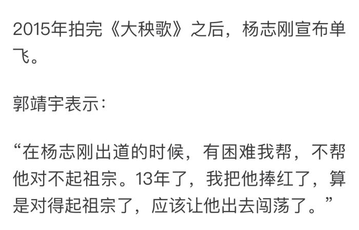 杨志刚出道以来,几部成名作品都是与兄弟郭靖宇合作。而在去年有消息称,二人已经决裂。杨志刚从郭靖宇的公司出走,自立门户,郭靖宇在节目中感慨道:"自己连续捧了他13年",可见对杨志刚的行为非常失望。
