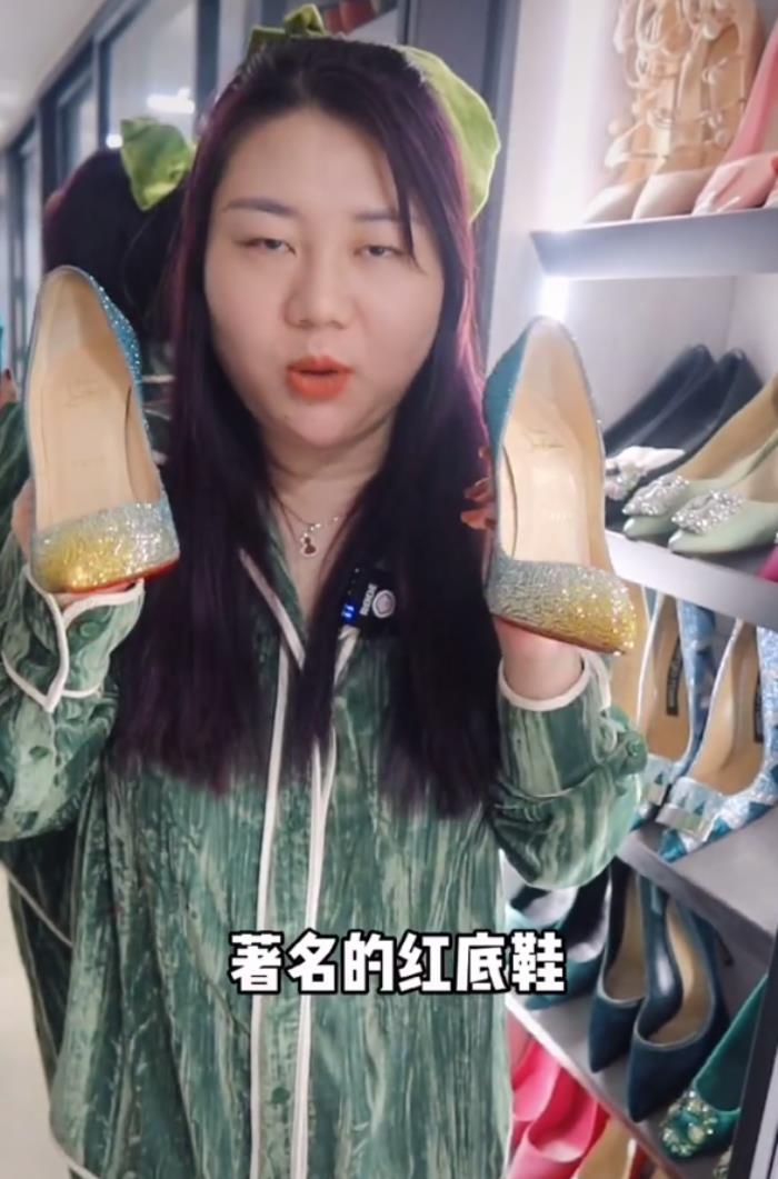 第一双是经典的红底鞋,这双鞋表面镶着渐变水钻,看起来很梦幻,但她说一只脚38码一只脚39码,尺码不适合所以穿不了。