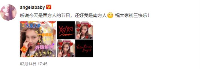而且在2月14日情人节这一天,baby也没有和黄晓明一起庆祝,甚至连示爱都没有,反而发文说:“听说今天是西方人的节日,还好我是南方人,祝大家初三快乐!”网友猜测她可能是在暗示自己已经恢复单身,所以不过情人节。