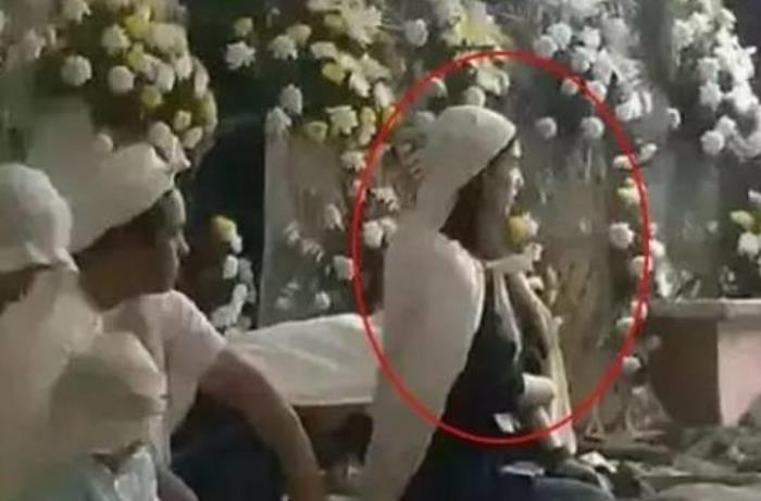 在葬礼上黄圣依披麻戴孝的跪在灵堂上
