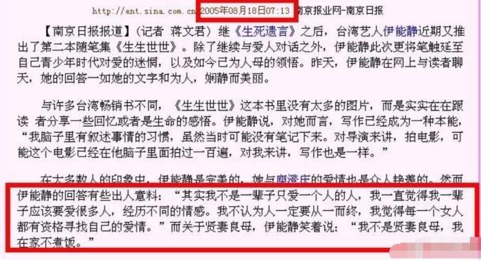 这又让我想起了伊能静在05年就曾经表达过自己的爱情观:我不是一辈子只爱一个人,我不认为人一定要从一而终,我觉得每一个女人都有资格寻找自己的爱情。