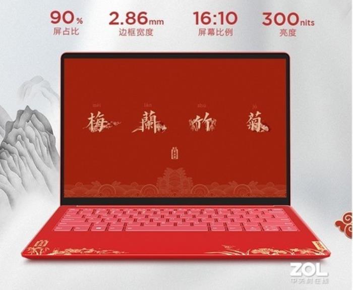 联想小新Pro13s故宫文创版采用非常有中国古典美的红金配色,其主颜色为红色,金色则是装饰。而且A面金色为海水江崖纹图案,C面金色为梅兰竹菊团花图案,两者均取自故宫博物院藏品“大红色缂丝彩绘八团梅兰竹菊袷袍”,非常有文艺气息。