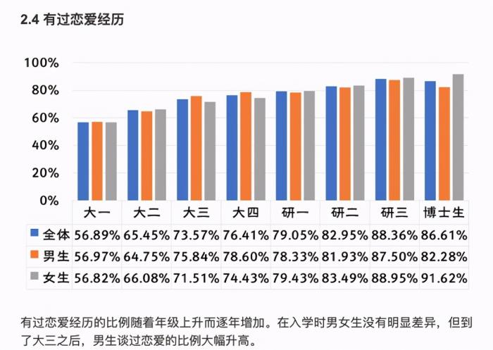 通过这个表格,我们也可以看出,其实上了大学之后,年纪越高谈恋爱的比例就会越大。