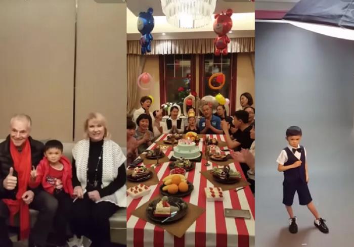 长条餐桌旁坐满了来祝贺的人,桌上摆着漂亮的双层生日蛋糕,头戴生日帽的范小勤正和大家一起拍着手唱生日歌,期间他被他人抱起来举高高,冲着镜头欢快地说“Happy Birthday”……视频里出现字幕:阿里巴巴太子爷的生日晚会。