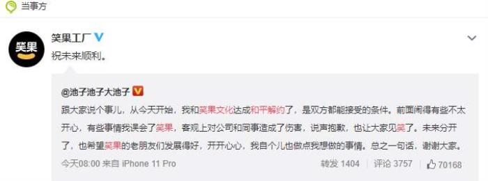 而就在5月池子发布长文,谴责了笑果文化进行了违约,拖欠了自己的演艺报酬,而笑果文化声明表示,从2020年1月开始,王越池(池子)没有得到公司的允许,一个人在外面参加商业活动,是他个人违约,还用邮件提出解约,公司在1月14日回复邮件,双方在签好的合同框架内,按照法律来处理解约。