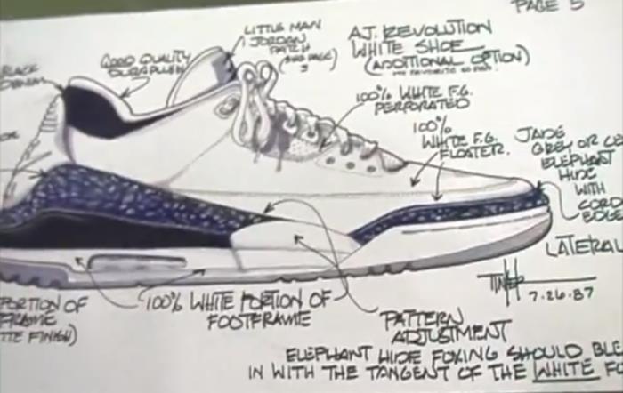 哈特菲尔德做出了一个大胆的决定,AJ3的设计灵感听取乔丹本人的意见,从乔丹的需求点出发。哈特菲尔德希望选择舒适且高档的皮革来设计,于是他找来了一堆皮质样本供乔丹参考,当乔丹看到一种仿大象皮的材料时他开心的说“就是这个了。”后来该材质正是AJ3鞋面标志性的爆裂纹。