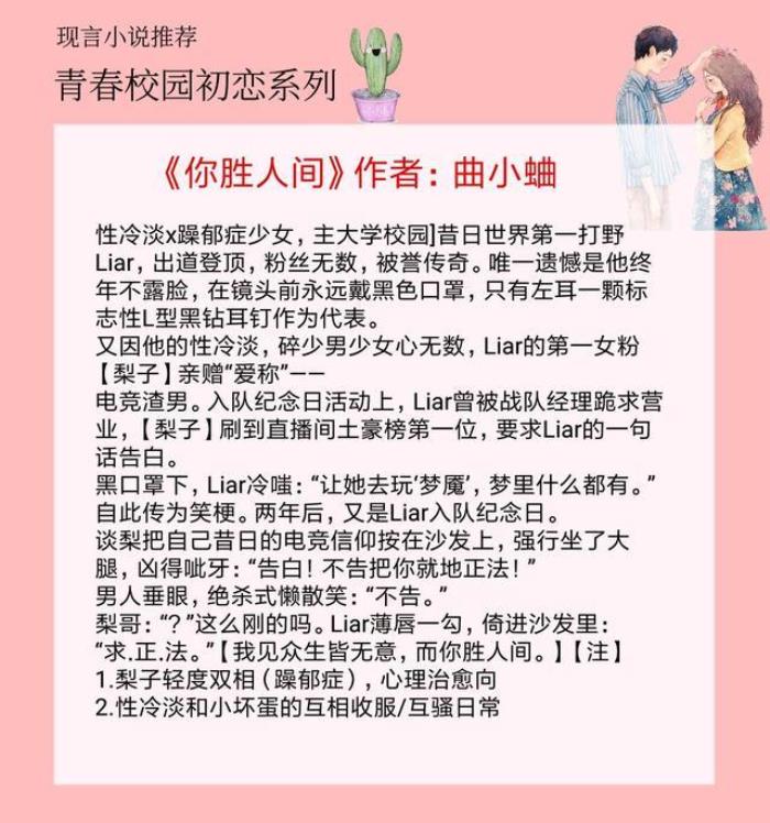 大家好,我是涵涵,今天推荐5本青春校园初恋文,男主外冷内娇,女主没心没肺,甜宠治愈(标题为第一本)