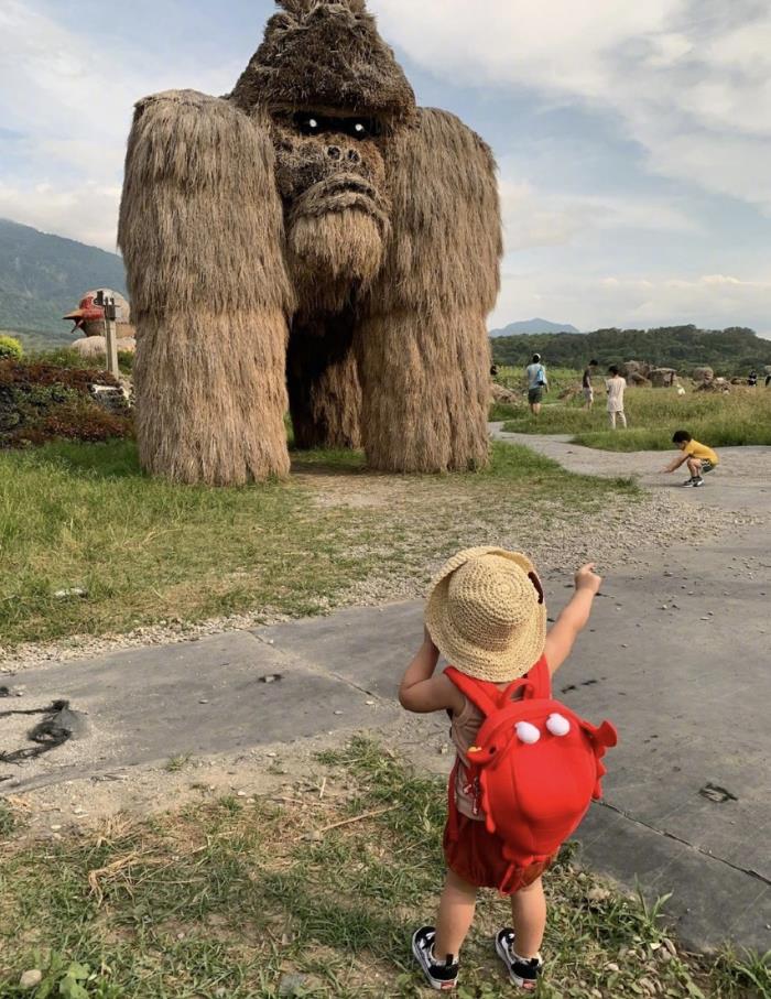 小公主戴着草帽,背着红色小书包,站在一个大猩猩的巨型“雕塑”面前,形成了鲜明的对比。