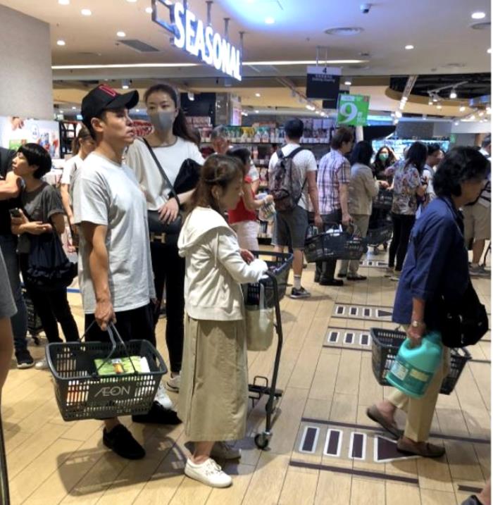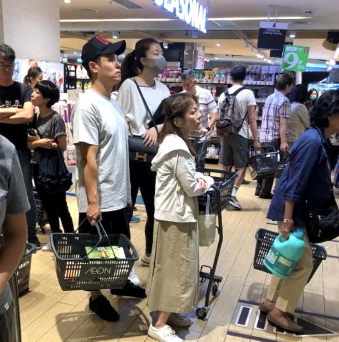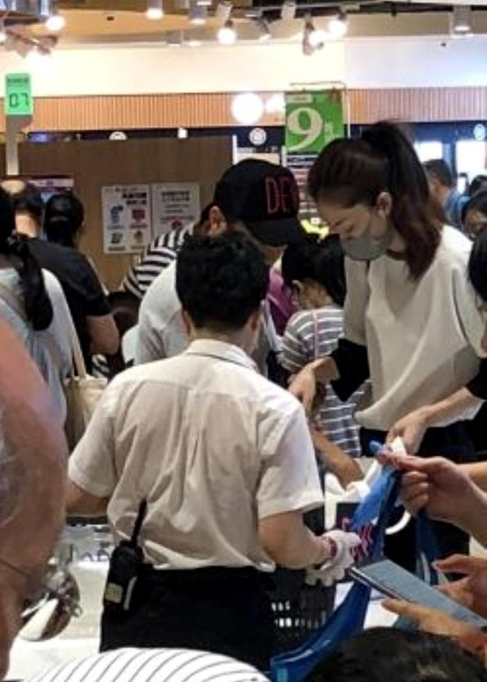当时熊黛林戴灰色口罩,肩挎名牌包包正焦急地看着长长的队伍。而郭可颂戴黑色棒球帽,穿搭朴素,手里提着若干商品,昂首挺胸看着前面。