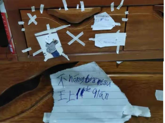2月12日,山东青岛,一个6岁男孩自制白色封条,把放压岁钱的柜子封了起来,上面特意写上“不 nong tou XX de qian(不能偷XX的钱)”,并用照片捍卫自己的权益。
