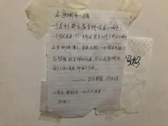 “成功”,成为了英姐在北下朱坚持的唯一动力。“有梦想就坚持别后退,别让这座城市留下了你的青春,却留不住你”、“没有梦想 ,何必义乌”,在屋内的一面墙上,英姐如此写到。