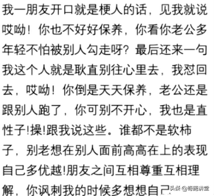 结果就旁边有人插嘴:你都这么大岁数了,还挑什么啊?随便找个人就算了呗,带去喝喜酒就不亏了啊。我这暴脾气立马回怼了一句:怎么?你家清明没地儿上坟,还现杀啊?一句话怼到她怀疑人生。这话虽然是老梗,但是怼的姐姐我开心!