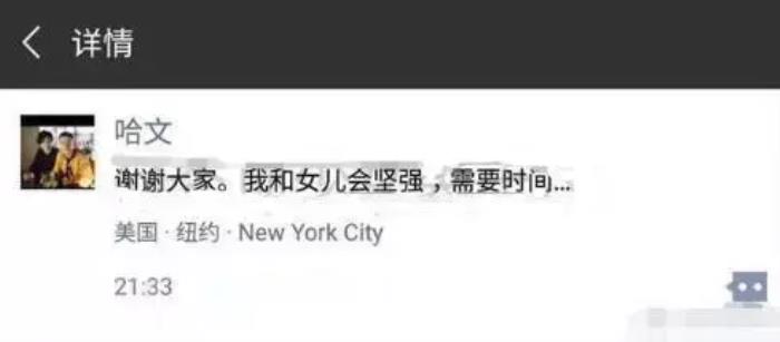 10月31日,有网友晒出一张哈文的朋友圈截图,写道:“谢谢大家,我和女儿会坚强,需要时间。”